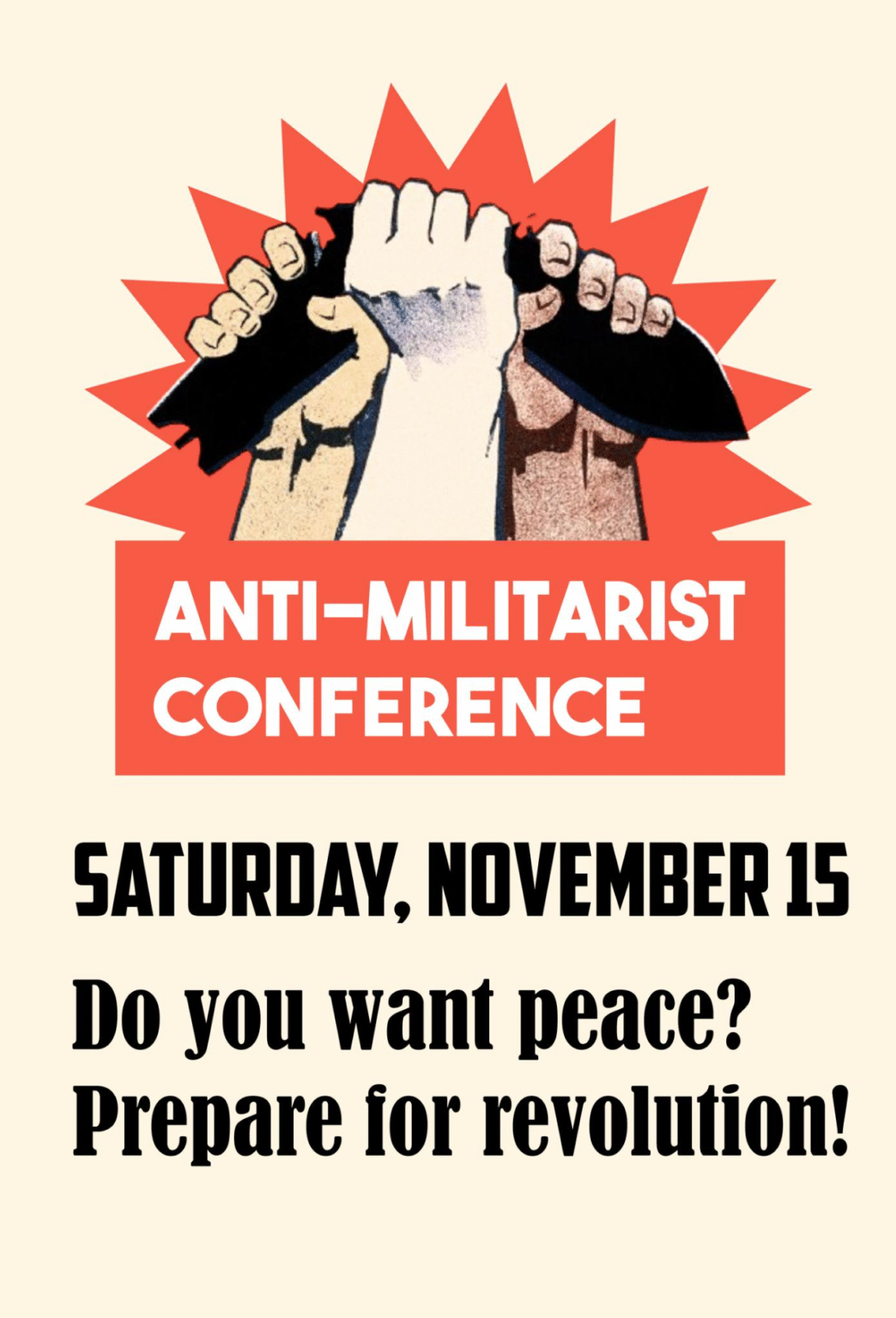 Nous invitons toutes les personnes qui souhaitent lutter contre la guerre, le militarisme et l’impĂ©rialisme Ă venir Ă notre confĂ©rence antimilitariste, Ă participer Ă la discussion et Ă rejoindre l’Organisation communiste rĂ©volutionnaire.